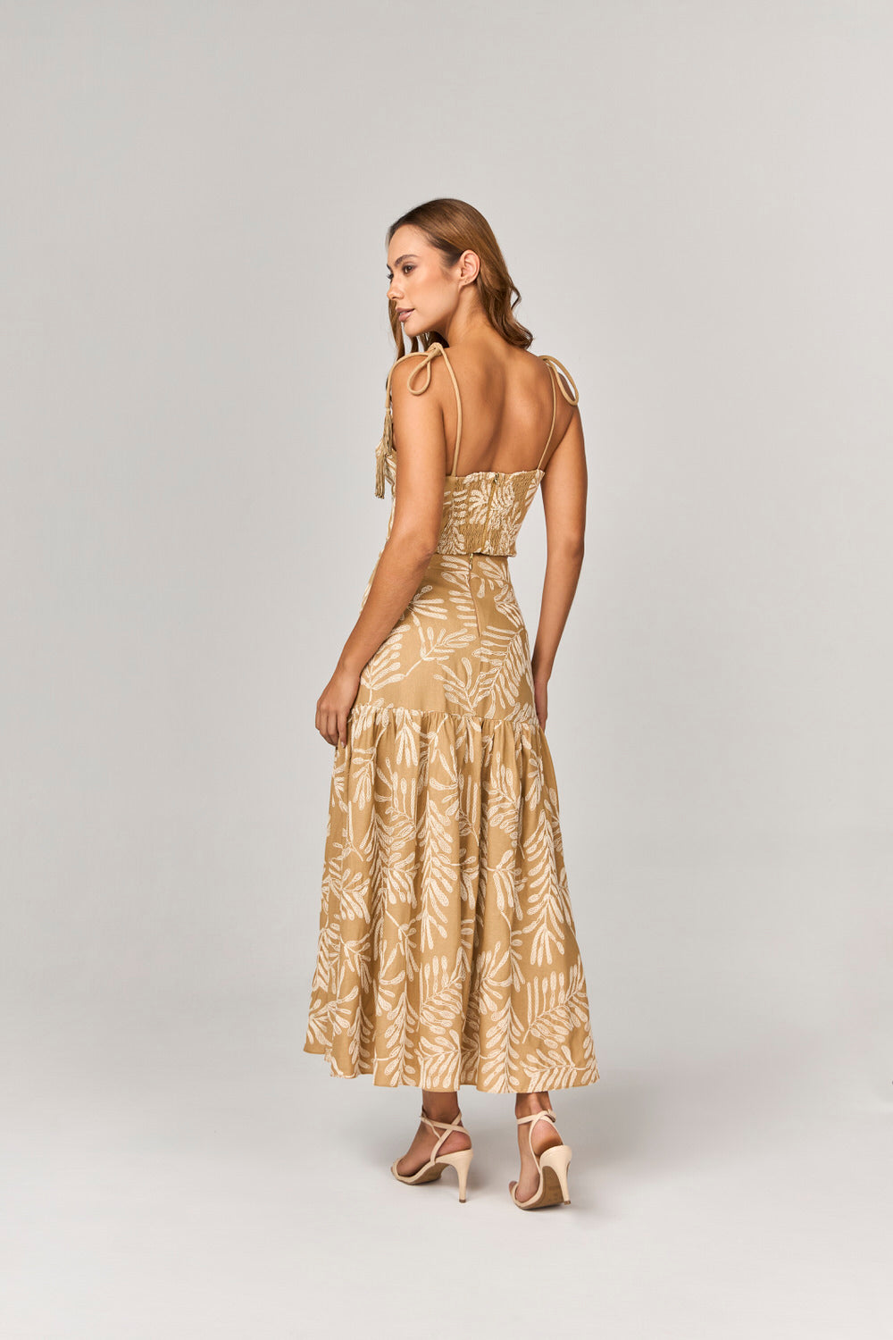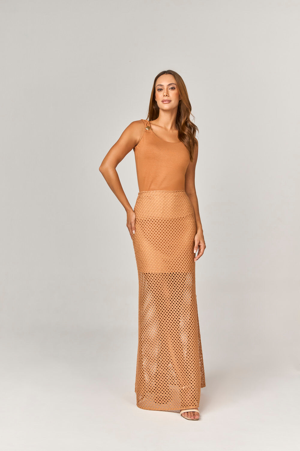 CONJUNTO SAIA MIDI E BLUSA COM BABADOS E DETALHE METAL