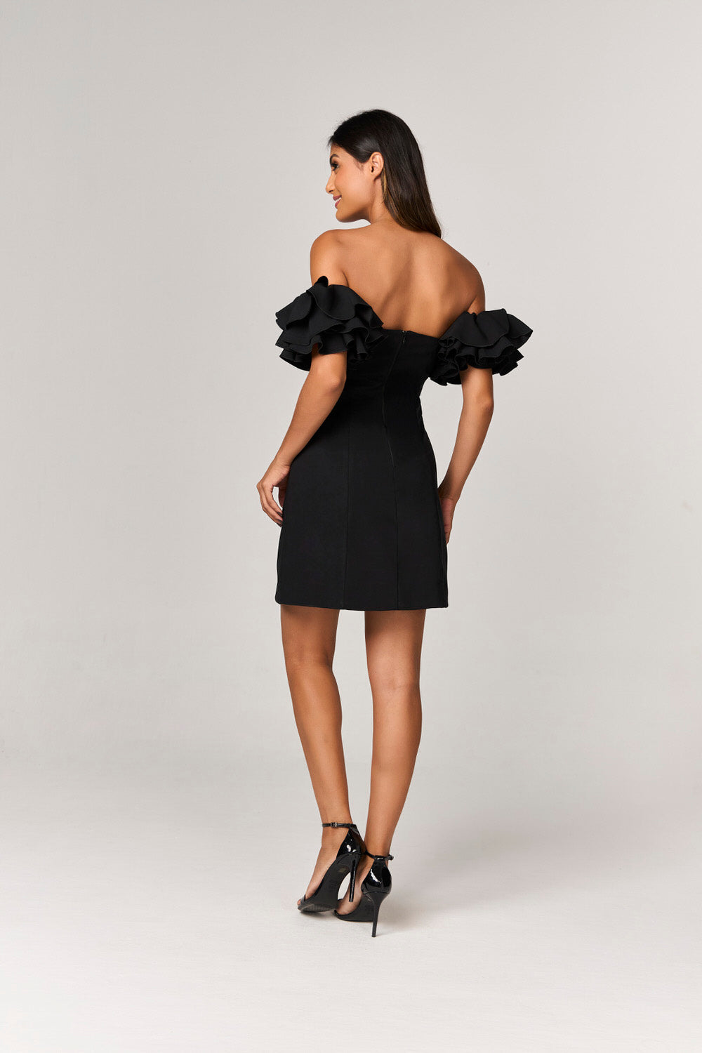 Apresentamos um vestido curto que exala elegância e sofisticação. Com seu decote reto e modelagem ajustada, este modelo foi desenvolvido para valorizar a silhueta feminina de maneira sublime. As mangas com babados removíveis conferem um toque de versatilidade, permitindo que você personalize seu visual conforme a ocasião. O fechamento com zíper nas costas garante um caimento perfeito, proporcionando conforto e praticidade.