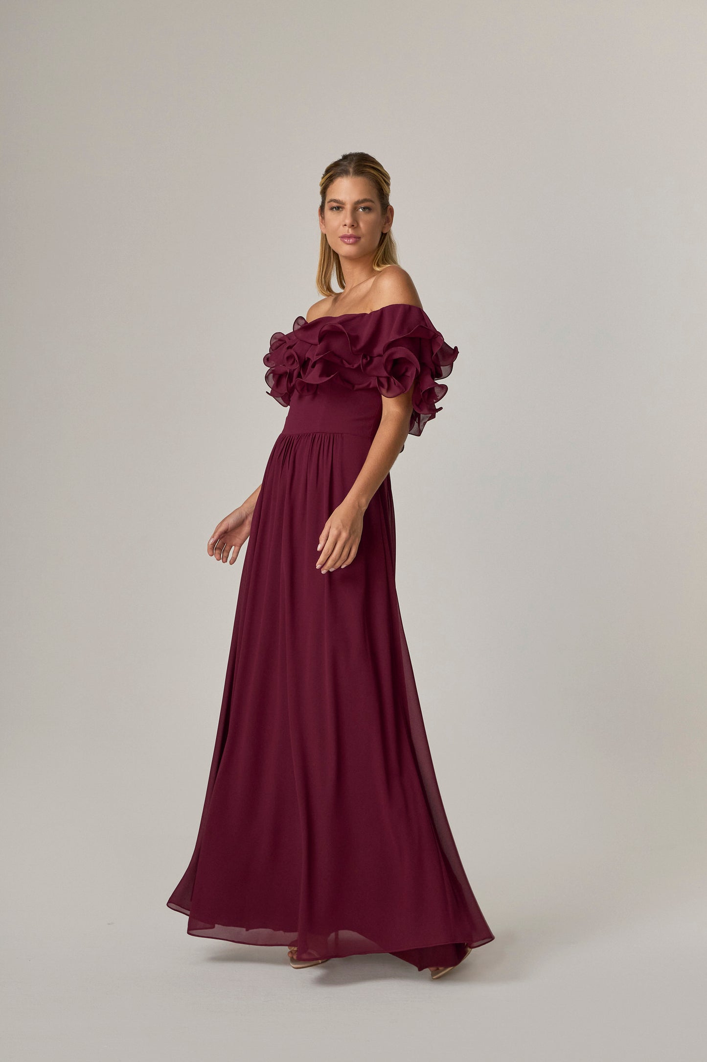 VESTIDO LONGO COM BABADOS OMBRO A OMBRO