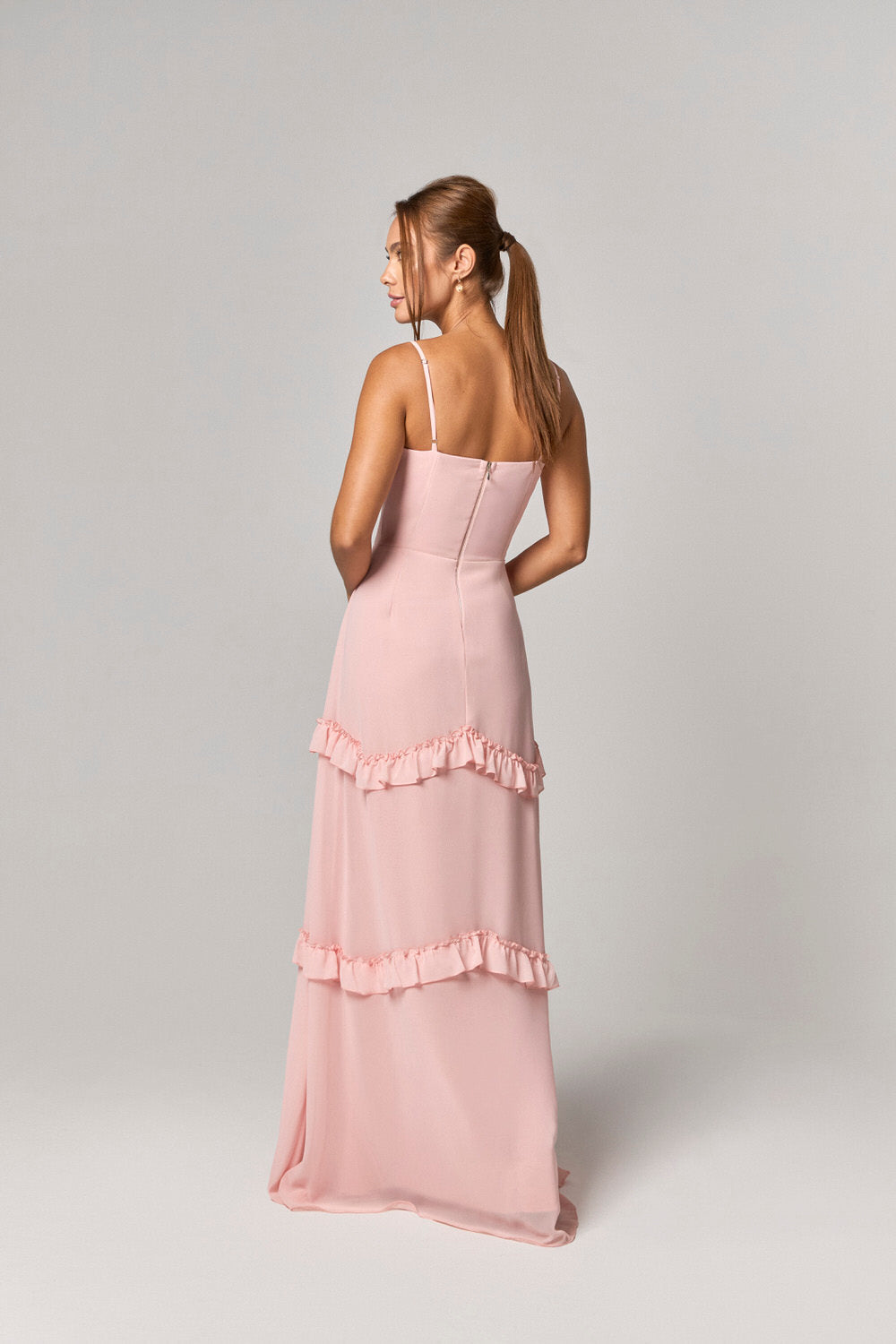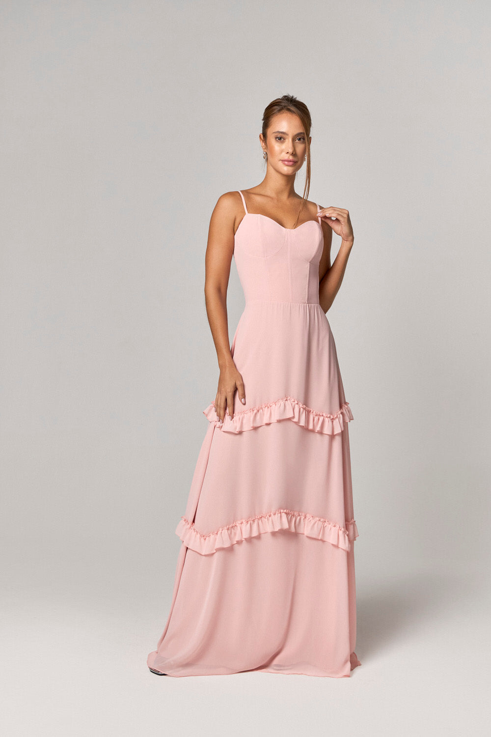 VESTIDO LONGO COM DETALHE CORSET E BABADOS
