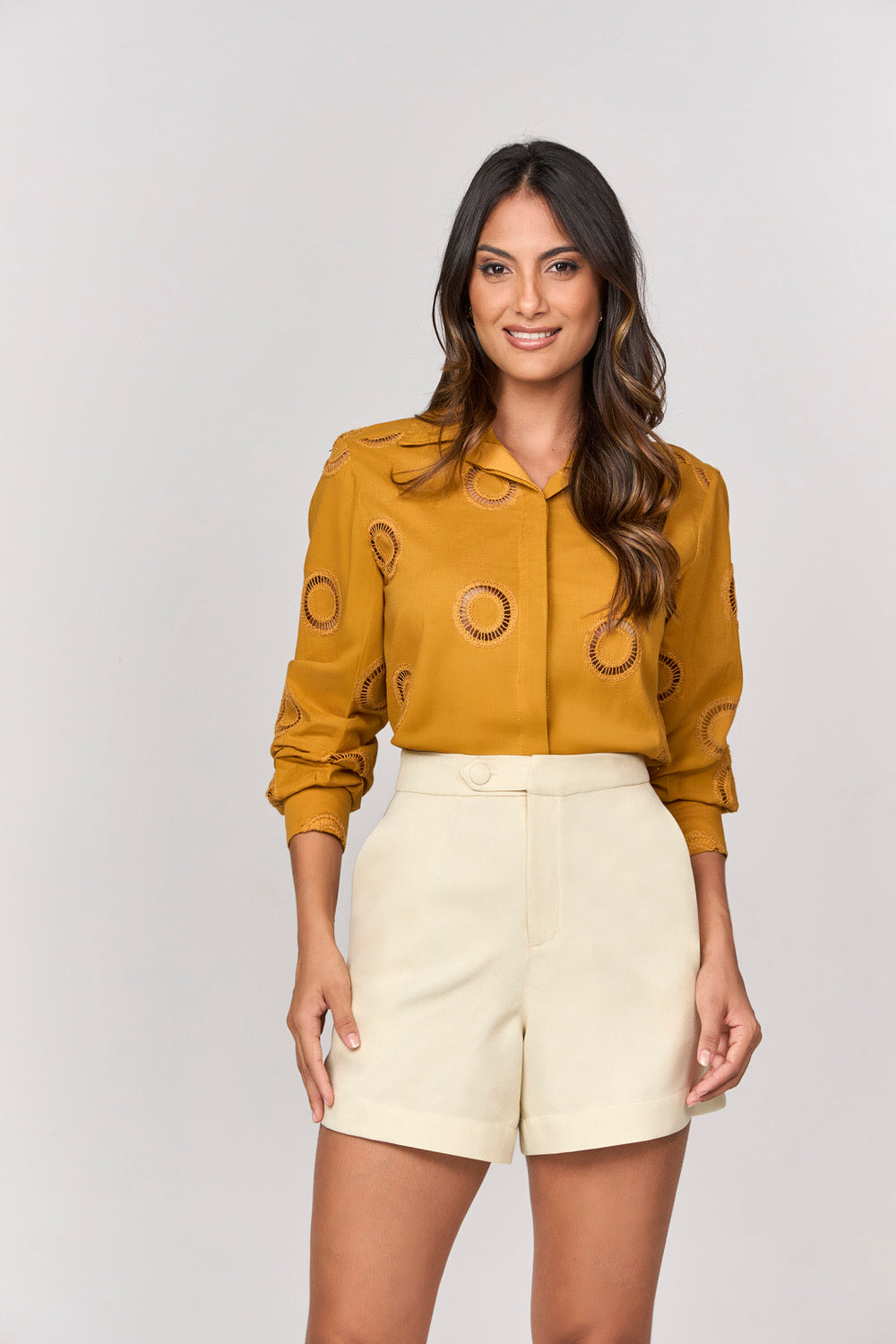 A blusa camisa apresenta um design elegante e sofisticado, ideal para compor looks que transitam entre o casual e o formal. Com um caimento amplo e confortável, esta peça é perfeita para o dia a dia, e sua modelagem proporciona liberdade de movimentos.