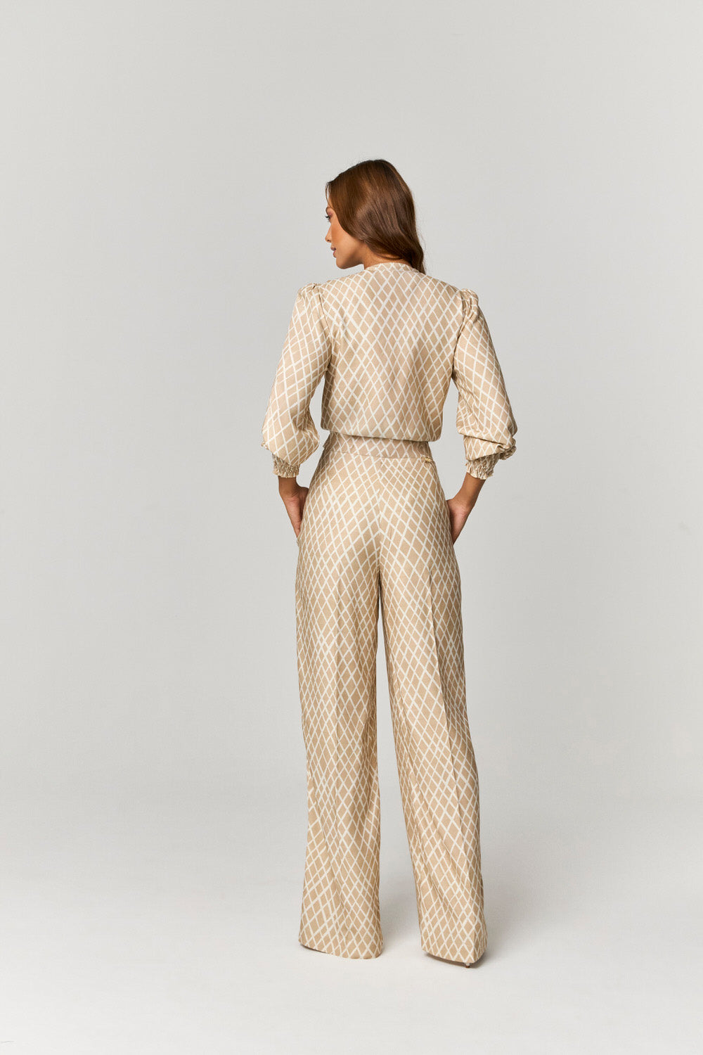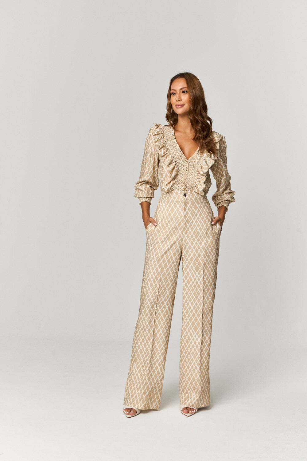 BLUSA ESTAMPADA COM FRANZIDOS E BABADO