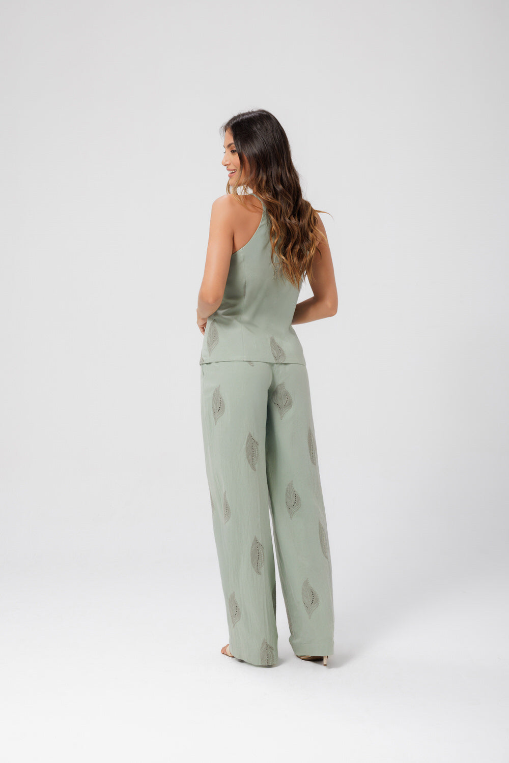 Experimente a transformação que o CONJUNTO CALÇA E COLETE COM TECIDO BORDADO E BOTÃO FLOR pode proporcionar ao seu guarda-roupa, oferecendo uma dose de glamour e classe para cada momento do seu dia.