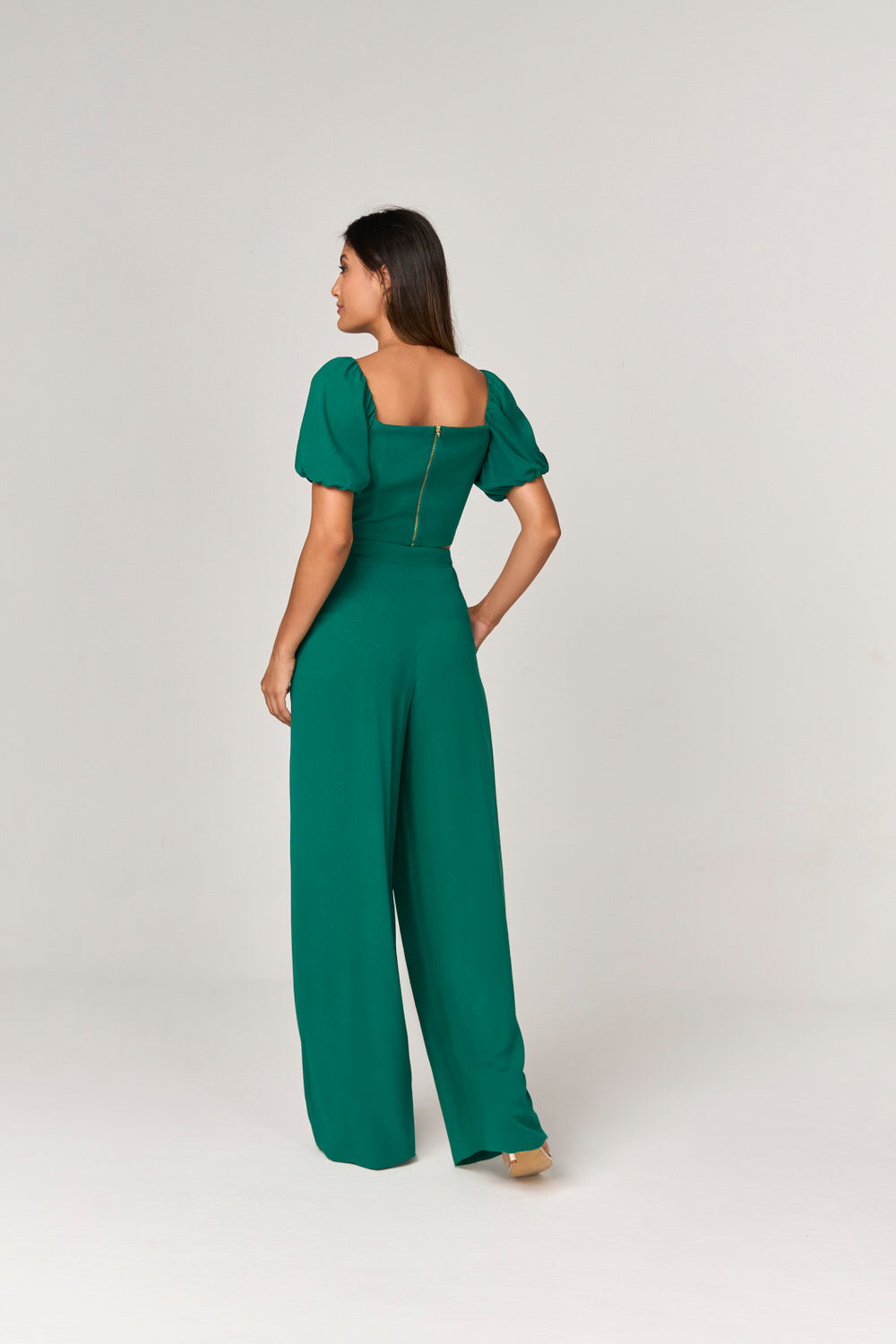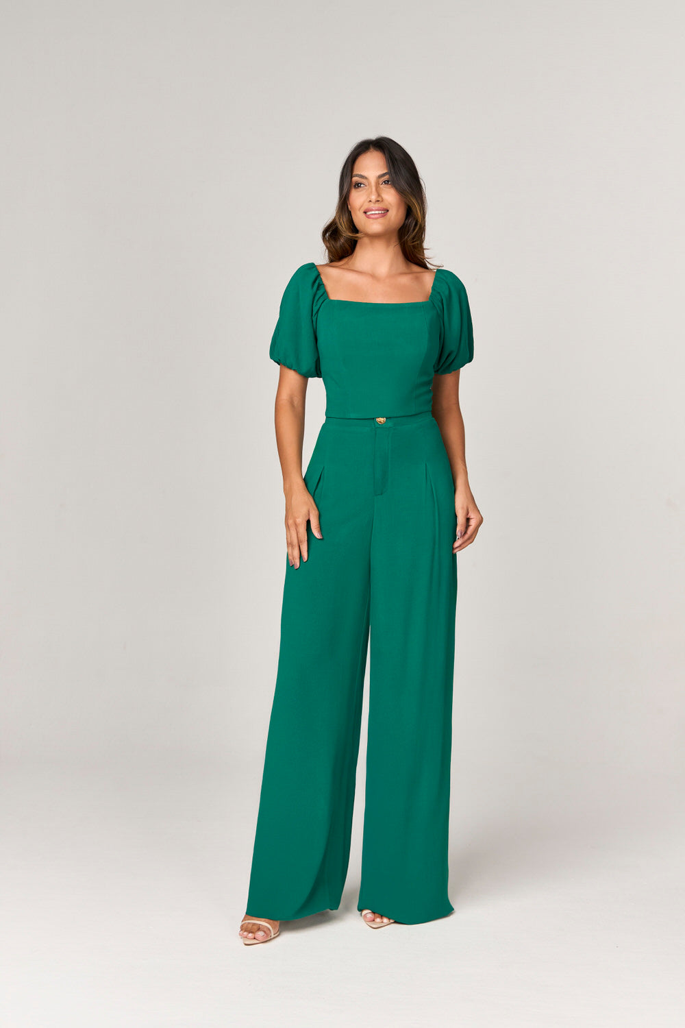 CONJUNTO CALCA E CROPPED COM DETALHE PREGAS E OMBRO A OMBRO