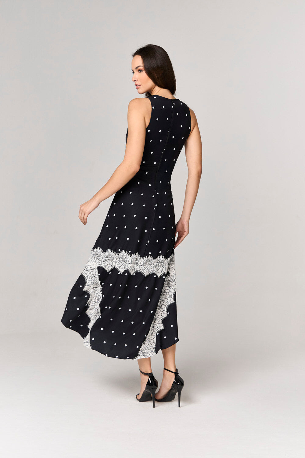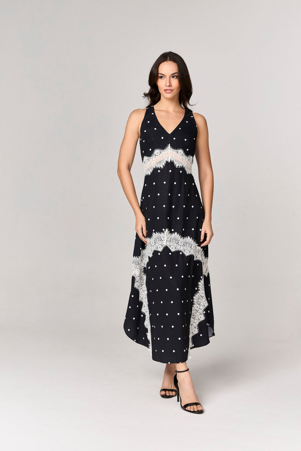 VESTIDO LONGO ESTAMPADO DE POA COM ASSIMETRIA E RENDA