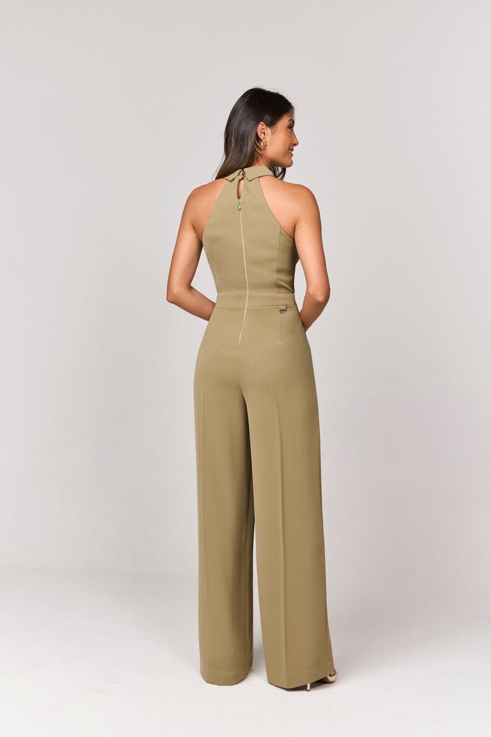 O puxador exclusivo do zíper frontal acrescenta um charme extra à peça, enquanto o fechamento posterior, meticulosamente elaborado com zíper e botão em gota, assegura um ajuste impecável. Confeccionado em 100% poliéster, este macacão apresenta um tecido de alta qualidade, que confere tanto conforto quanto durabilidade.