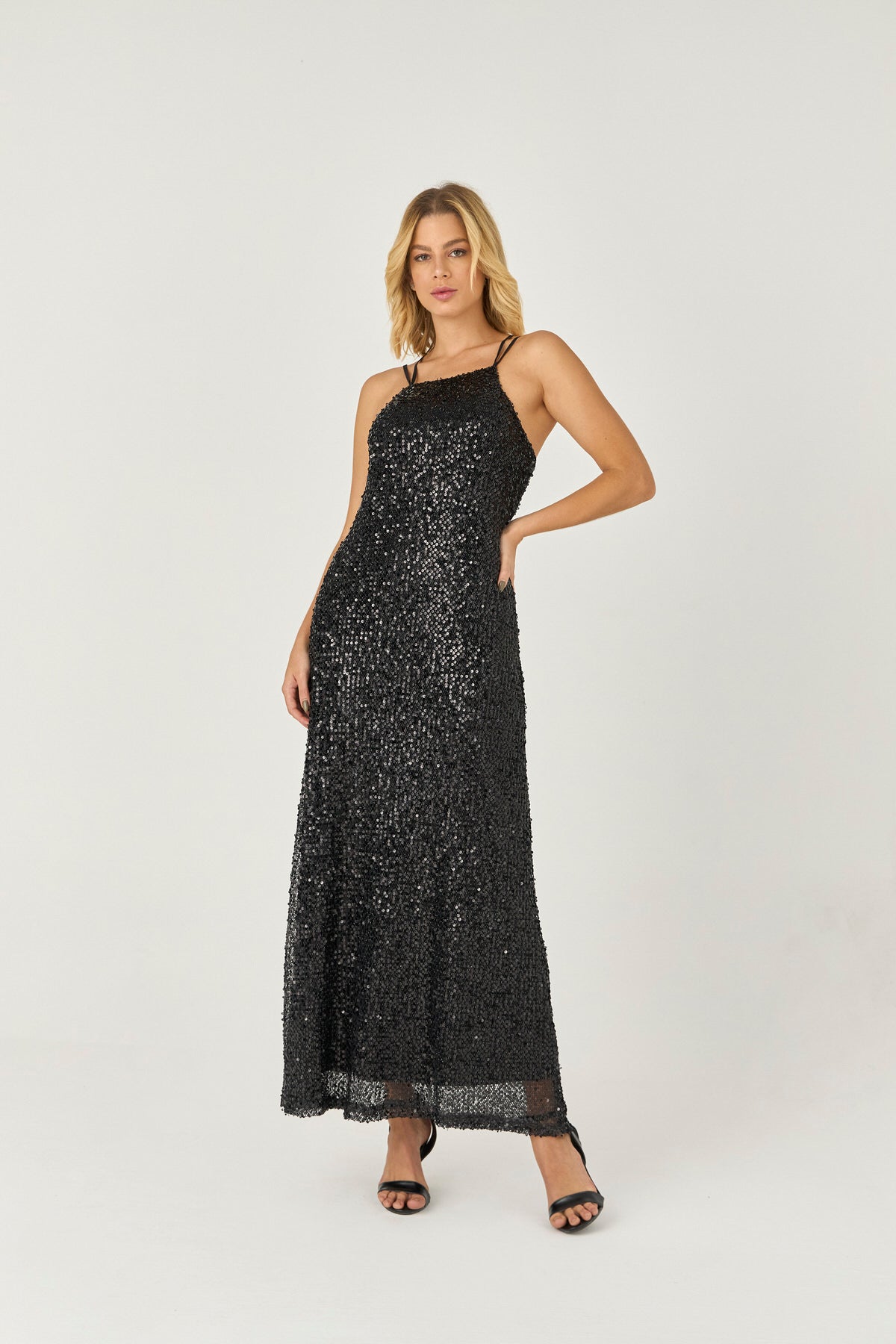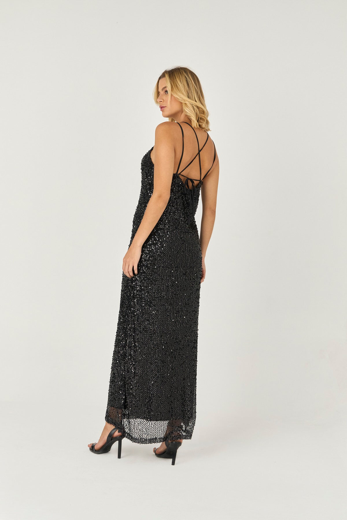 VESTIDO LONGO DE PAETE COM DETALHE LACO