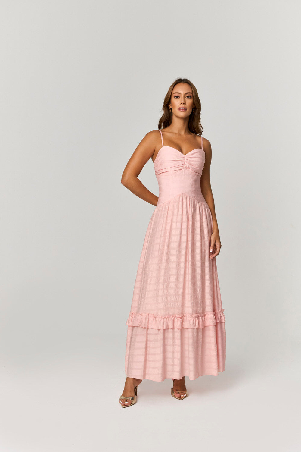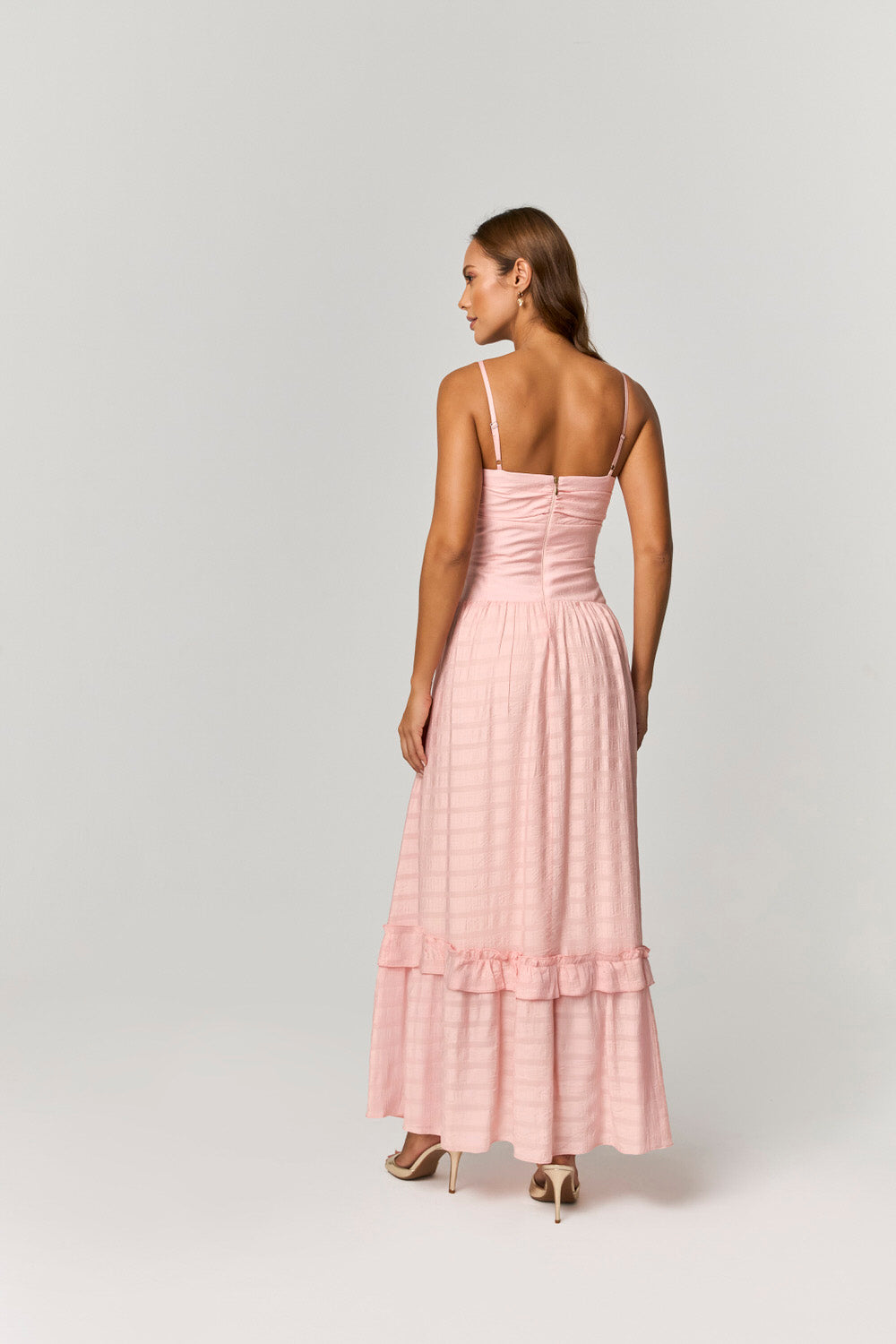 VESTIDO MIDI COM DETALHE FRANZIDO E BABADOS