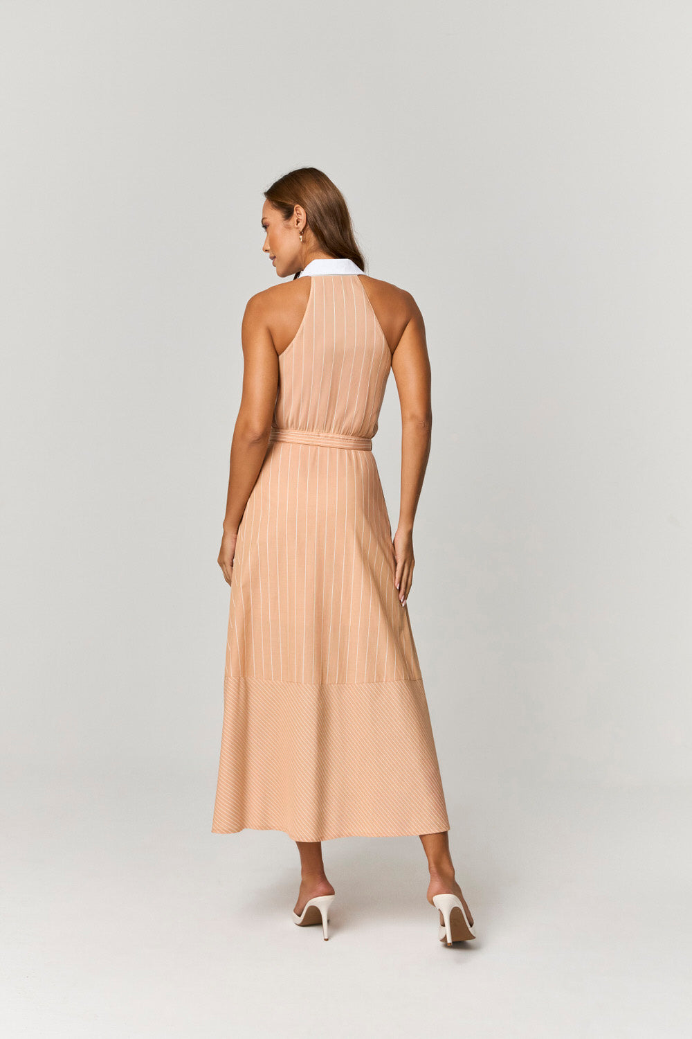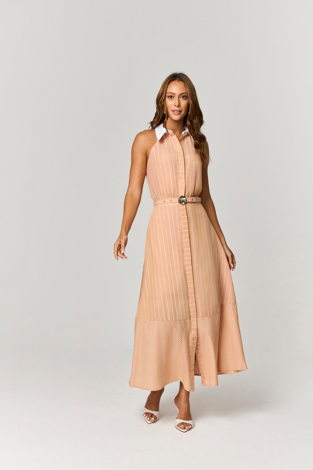 VESTIDO MIDI COM MIX DE LISTRAS E DETALHE CINTO