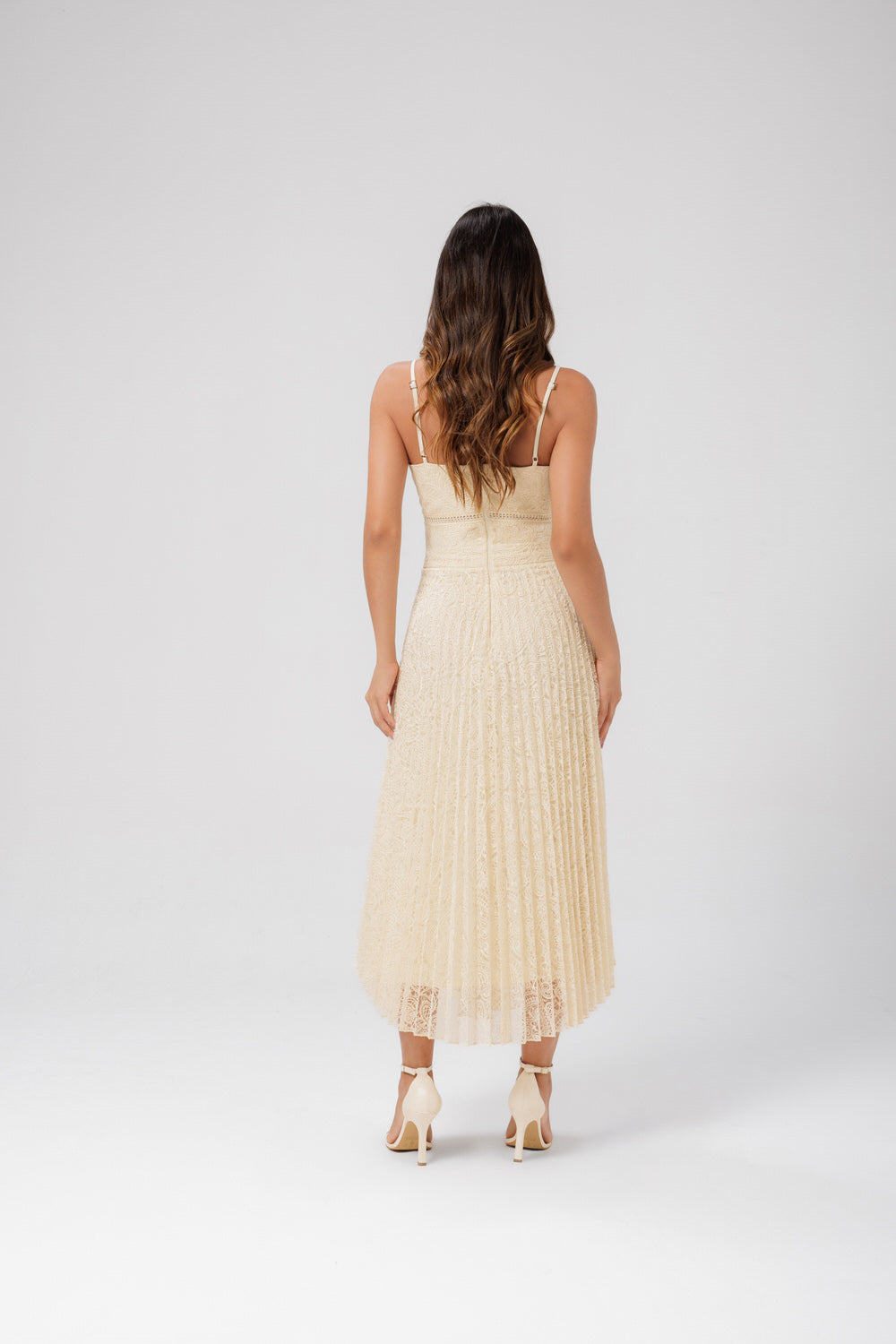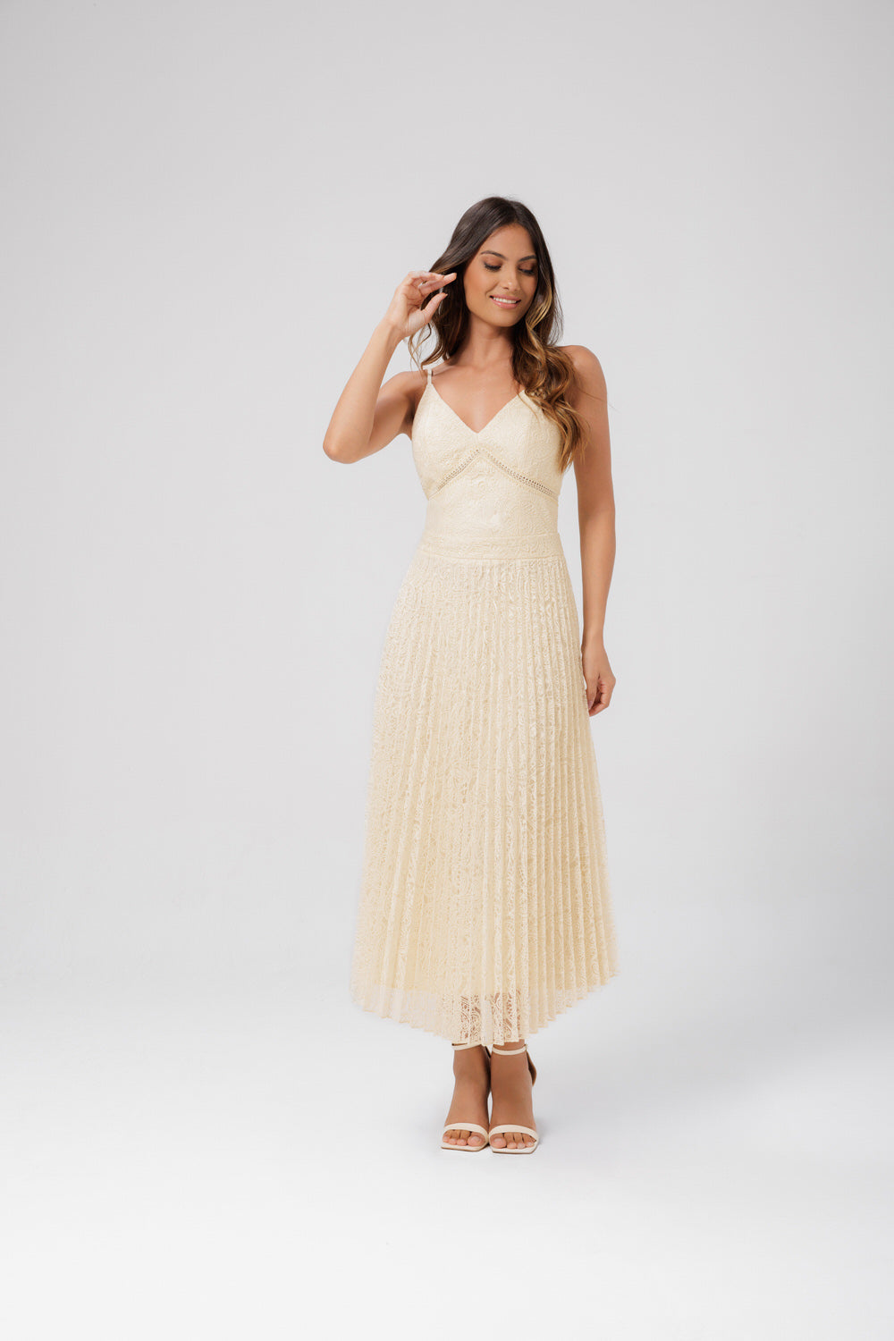 VESTIDO MIDI PLISSADO COM DETALHE RENDA