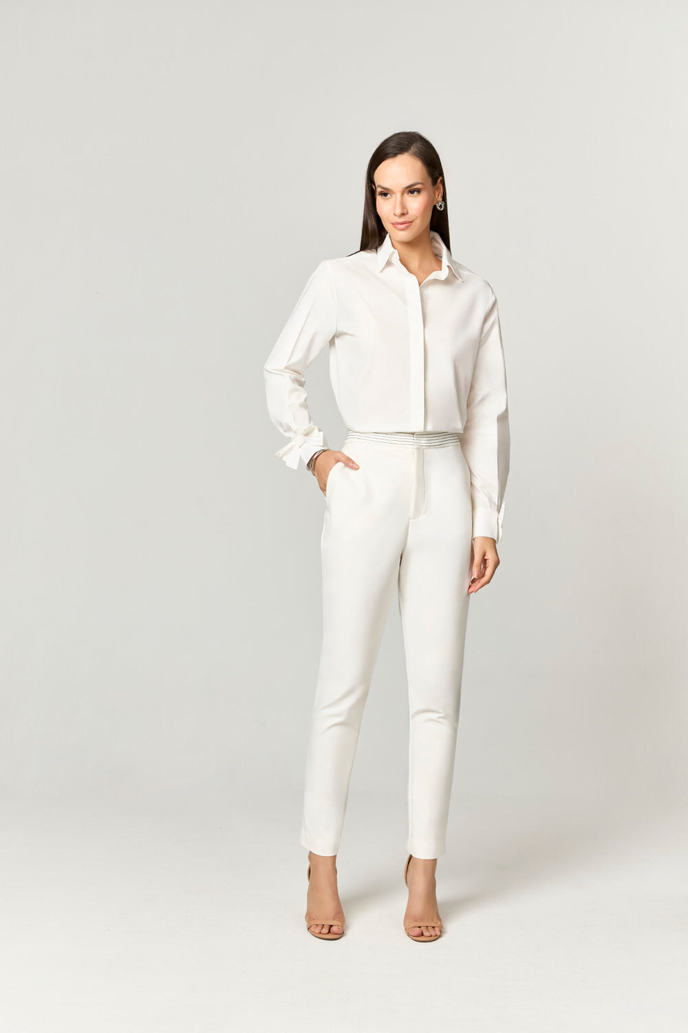 Blusa camisa em tecido tricoline com corte refinado que valoriza a silhueta de forma sutil e elegante. A modelagem reta e o comprimento médio conferem um caimento contemporâneo, perfeito para compor looks formais e ocasiões que exigem presença. O acabamento da gola com colarinho padrão e a tapeta coberta com fechamento frontal por botões reforçam o caráter clássico e atemporal da peça.