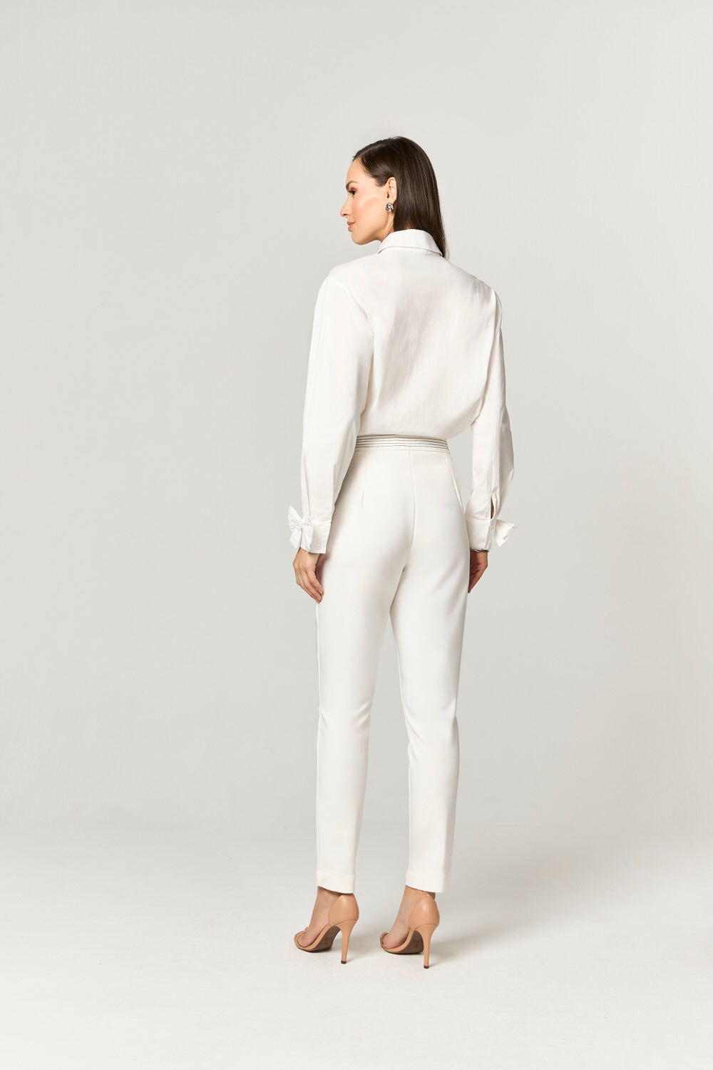 Mangas longas com punho ajustado e detalhe de laço removível que proporciona versatilidade ao visual: mantenha a proposta sofisticada ou acrescente um toque feminino e exclusivo conforme a ocasião. Confeccionada em tecido com toque macio e leve elasticidade, oferece conforto sem comprometer a estrutura. Ideal para quem busca peças de alto padrão, com design discreto e acabamento primoroso.
