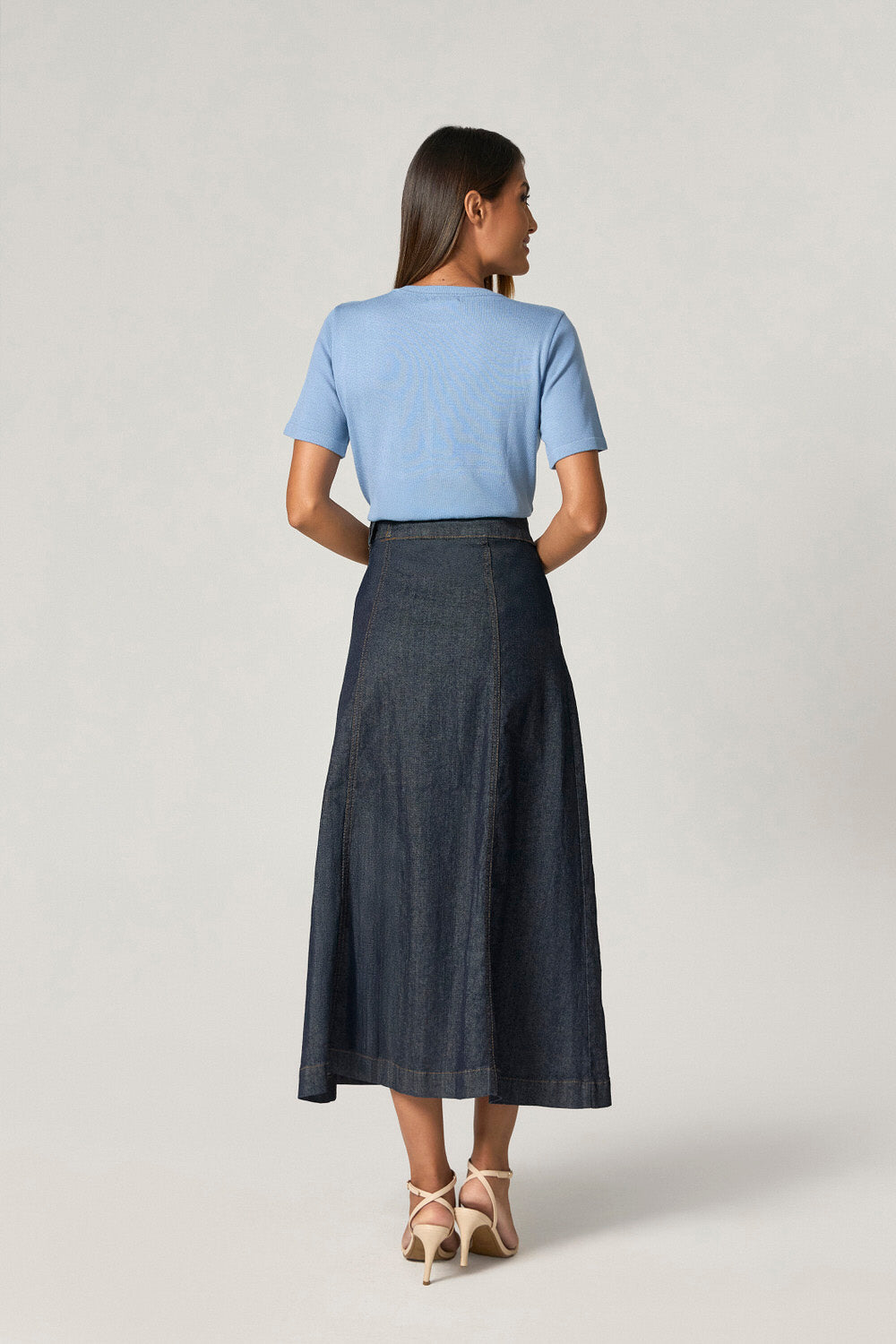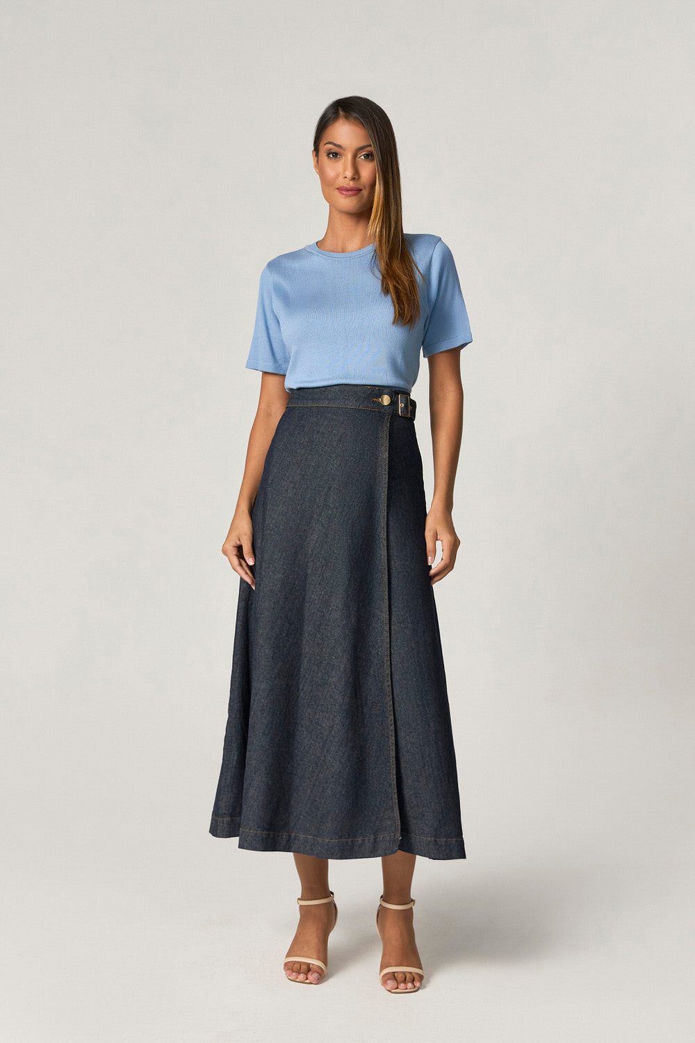 SAIA MIDI JEANS COM DETALHE FIVELA