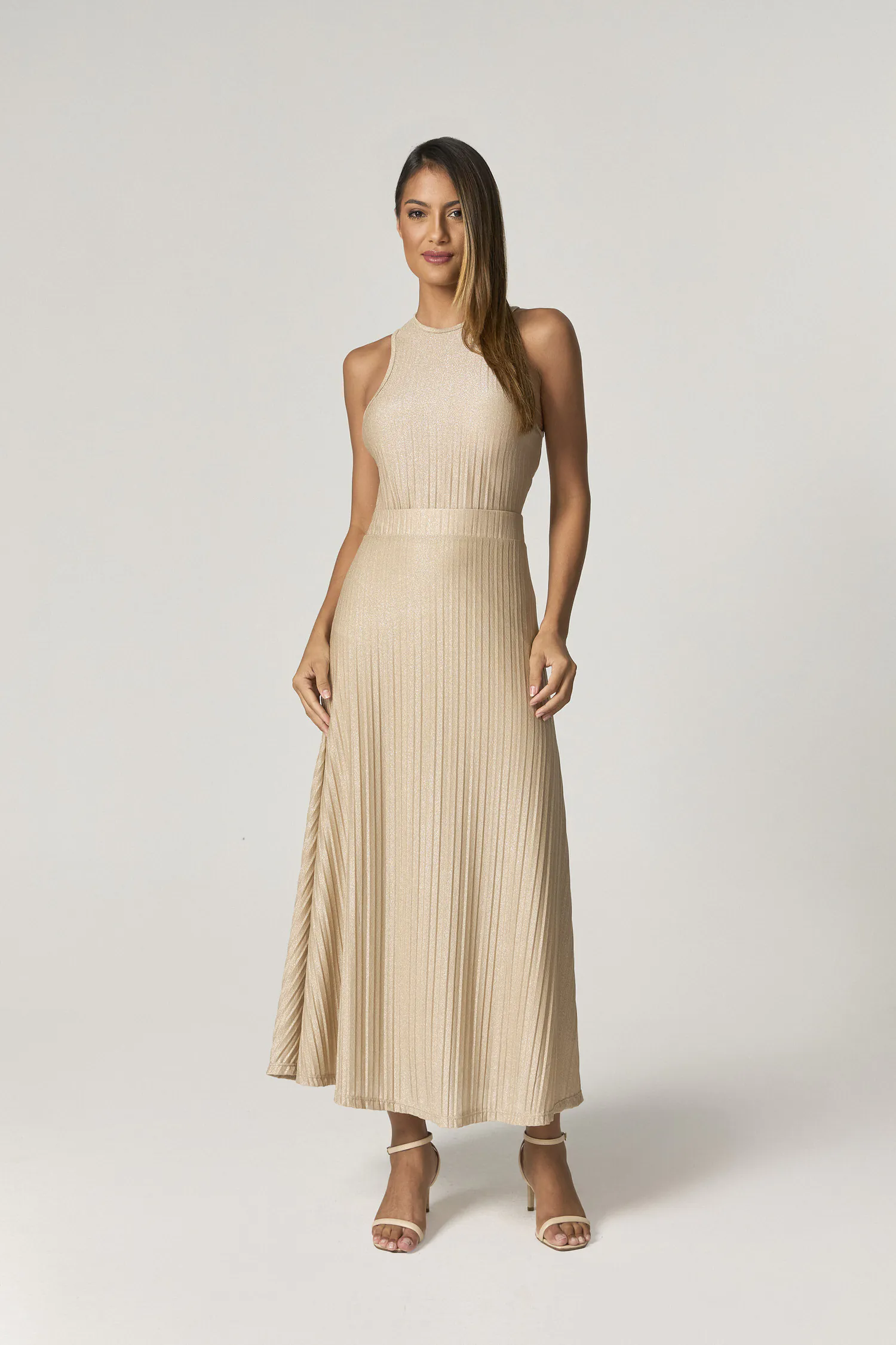 Conjunto em tecido de fibra artificial. Tecido possui plissado e brilho discreto em sua trama. Acompanha regata estilo nadador e saia midi com modelagem evasê.