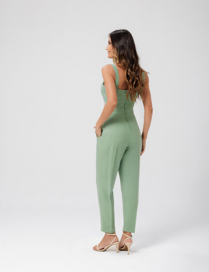 Macaquinho em alfaiataria de tecido de fibra artificial, viscose e linho. Tecido possui listras em tom sobre tom na trama, decote com recortes estrat?gicos, fechamento por z?per e el?stico nas costas para melhor ajuste ao corpo. Acompanha cinto coberto de mesmo tecido.