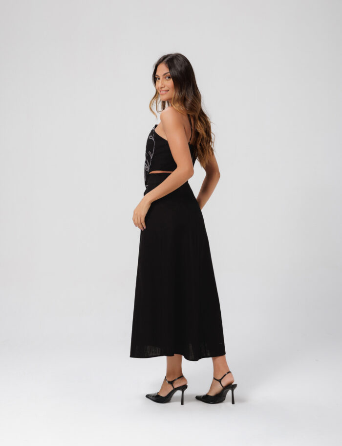 Saia em viscose, possui aplica??o de babados assim?tricos ao longo da pe?a. Tecido possui fluidez e leve transpar?ncia.