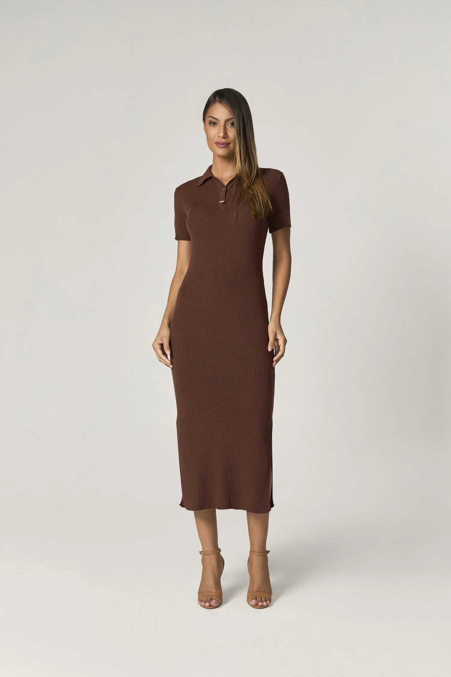 ÚLTIMA PEÇAVestido em tricot canelado de tecido de fibra artificial e elastano. Possui mangas curtas, gola em ribana com aplicação de botões de desenvolvimento exclusivo e fendas laterais. Tecido possui alta gramatura e textura canelada.