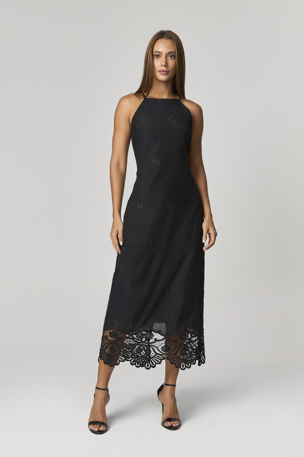 ÚLTIMA PEÇAVestido em algodão e tecido de fibra artificial. Modelo possui comprimento midi, levemente ajustado ao corpo, aplicação de renda na barra, alças finas e fechamento por zíper nas costas. Tecido possui aplicações de bordados ao longo da peça.