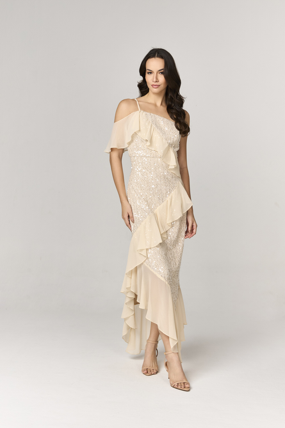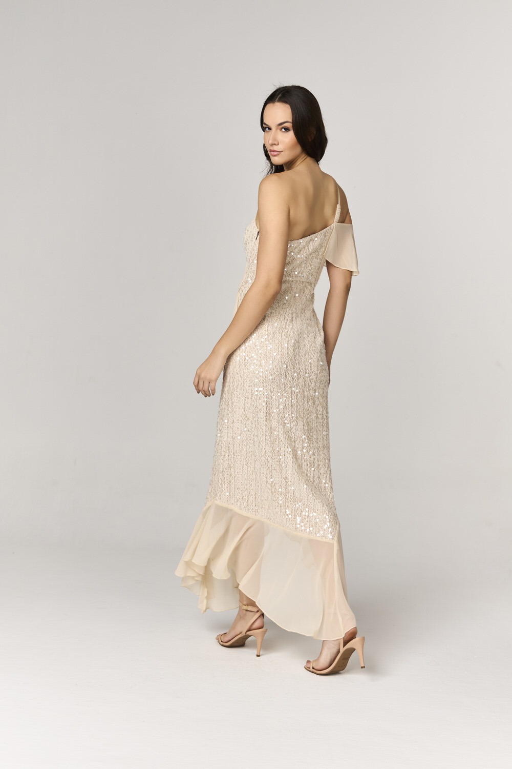 Com um design que realça a silhueta feminina, este vestido é adornado com detalhes em paetê que capturam a luz de maneira deslumbrante, oferecendo um brilho sutil que é perfeito tanto para eventos diurnos quanto noturnos. Cada detalhe foi cuidadosamente pensado para proporcionar um caimento impecável.